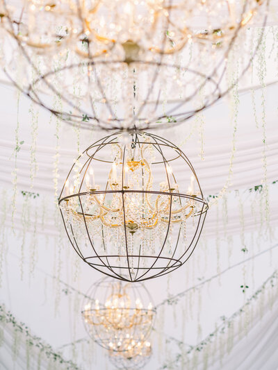 Dazzling crystal chandeliers evoke timeless elegance with their crystal drops, showering the space with sparkle. Chandeliers are on dimmers, so they can be adjusted to create the ambiance of your choice.